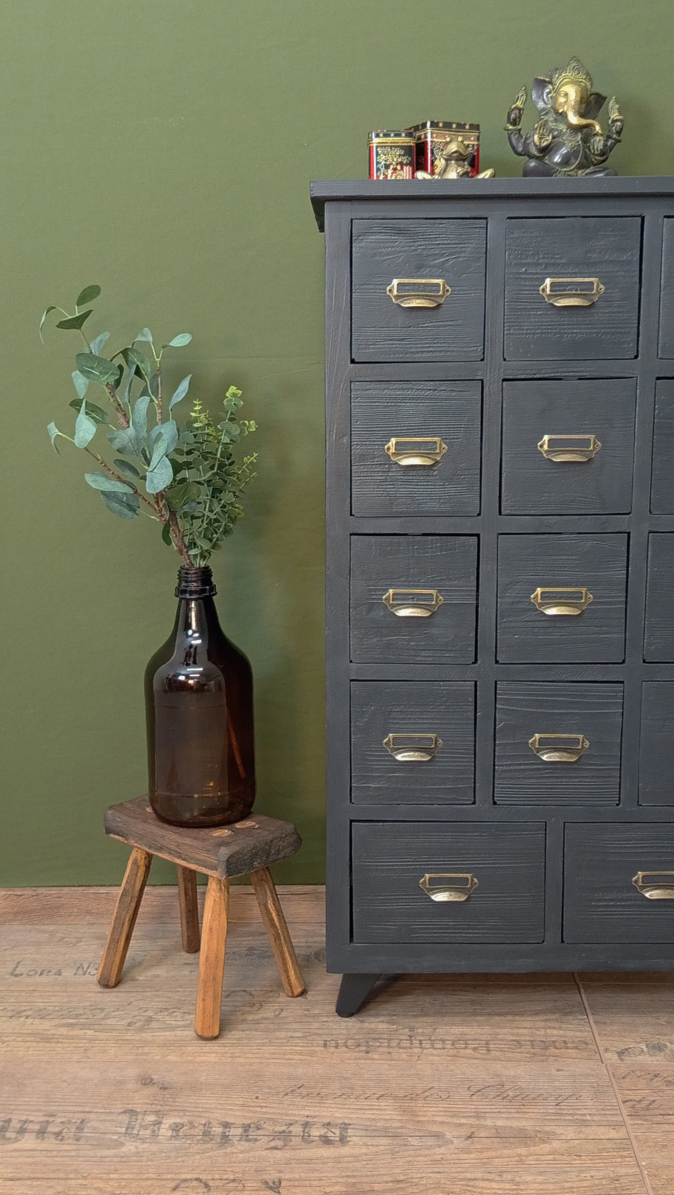 Upcycling-Möbel-Kollektion Charakter und Eleganz Kastellanische Aufbewahrung Mid-Century-Kästchen Stilvolle dunkle Apothekerschrank Magnolia in Bloom Rustic Charm Schrank Der Sage Schrank Der Ombré-Nähtisch Upcycelter Apothekerschrank mit Textur Verbesserte handgefertigte Truhe Ich möchte mehr erfahren