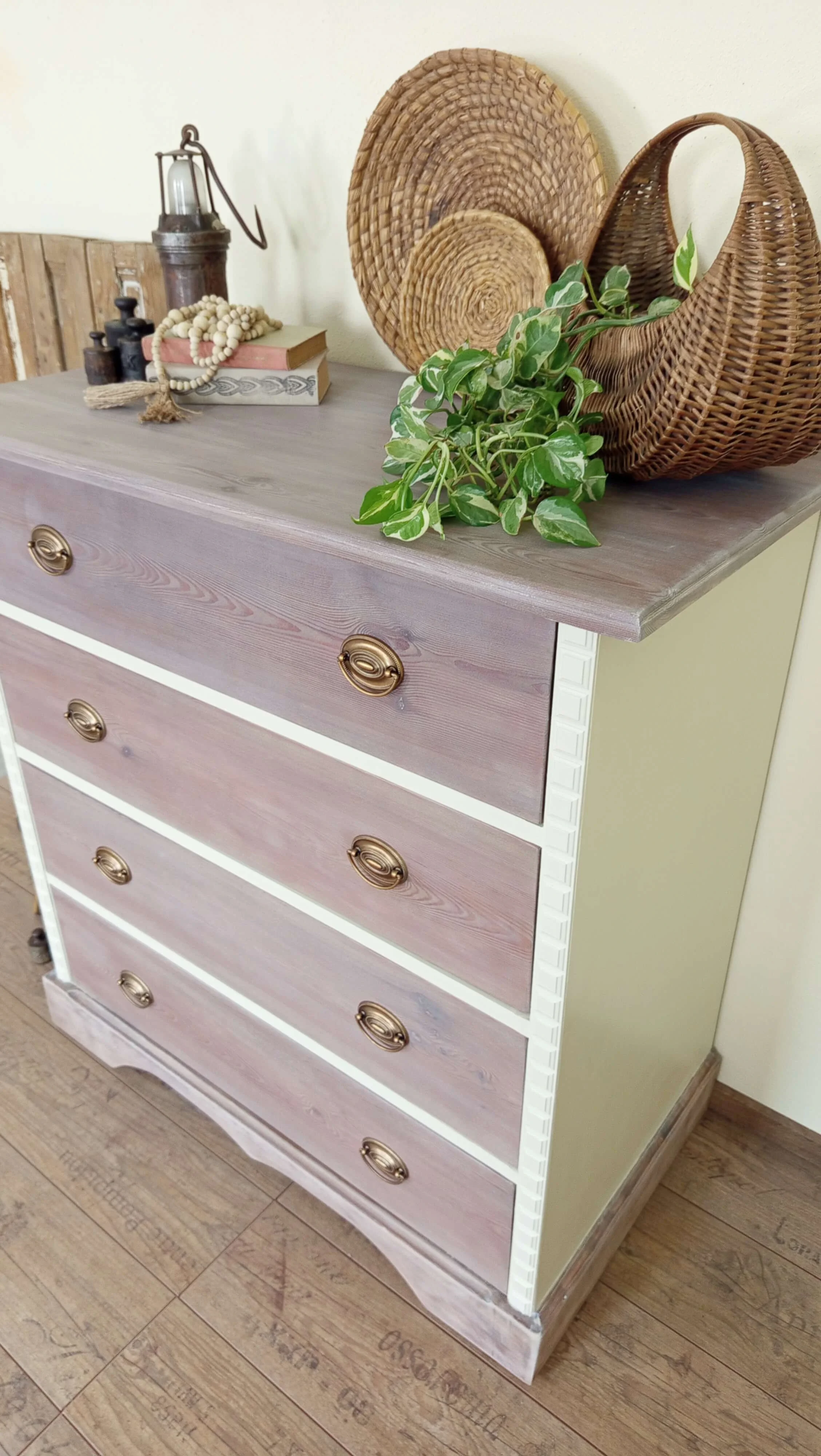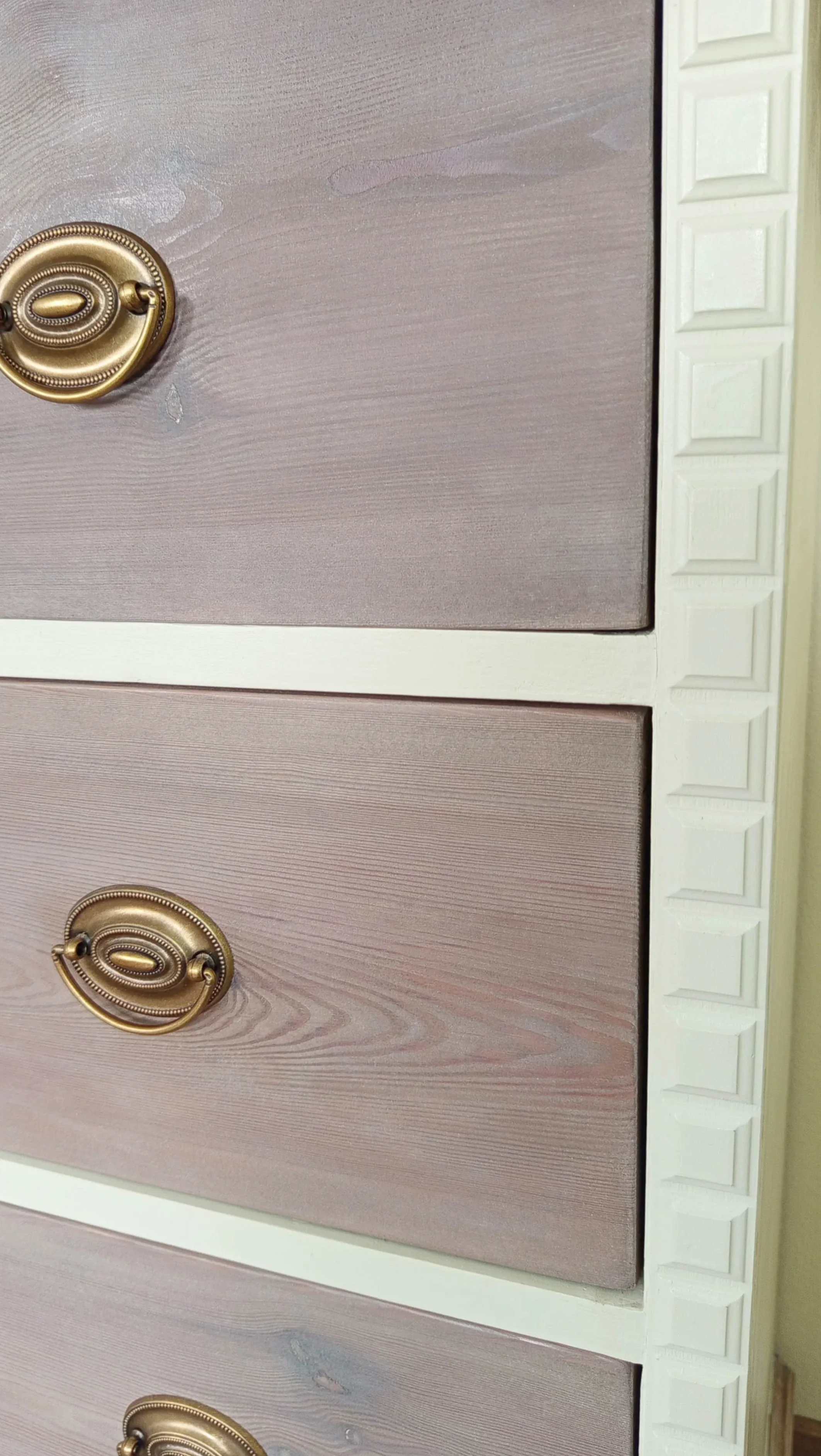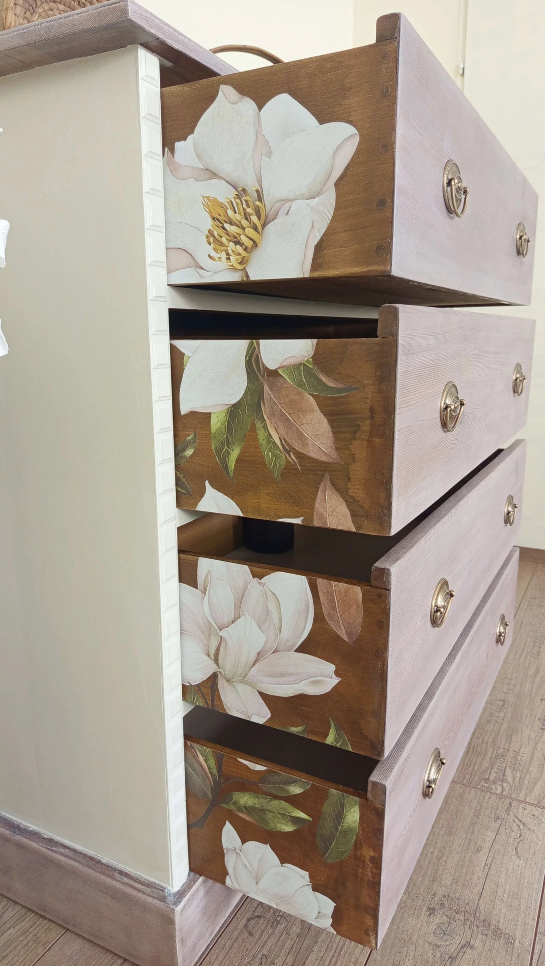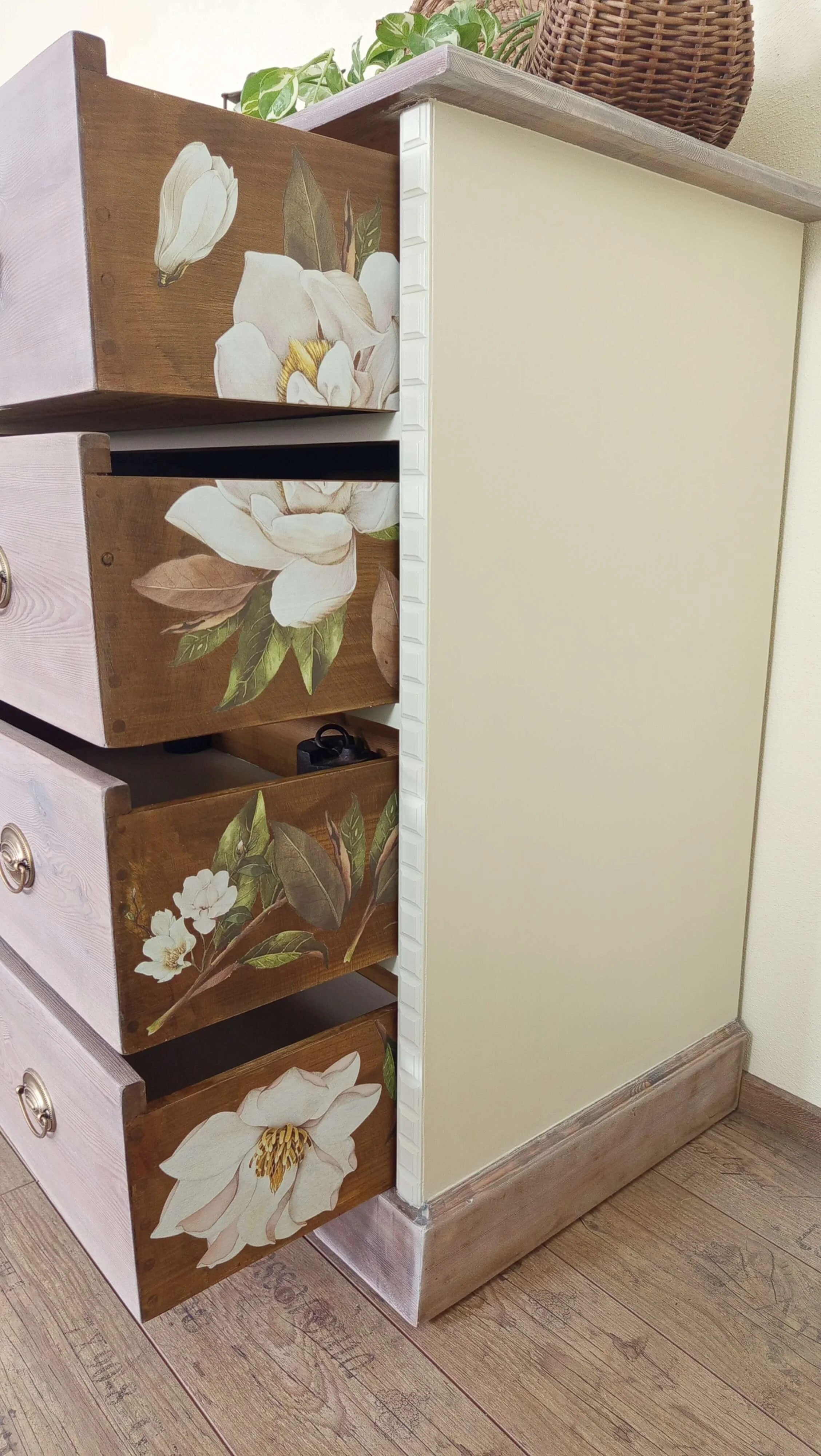 Als es zu mir kam, war es dunkel, schwer – ein bisschen vergessen. Ich habe die Oberfläche behutsam geschliffen und mit einer zarten Fliederlasur veredelt, sodass die schöne Holzstruktur sichtbar bleibt. Die Seiten habe ich in Creme gehalten, um Leichtigkeit und Kontrast hineinzubringen. Und an den Schubladen: florale Details, von Hand aufgetragen – wie kleine Geschichten, die sich Schublade für Schublade entfalten.