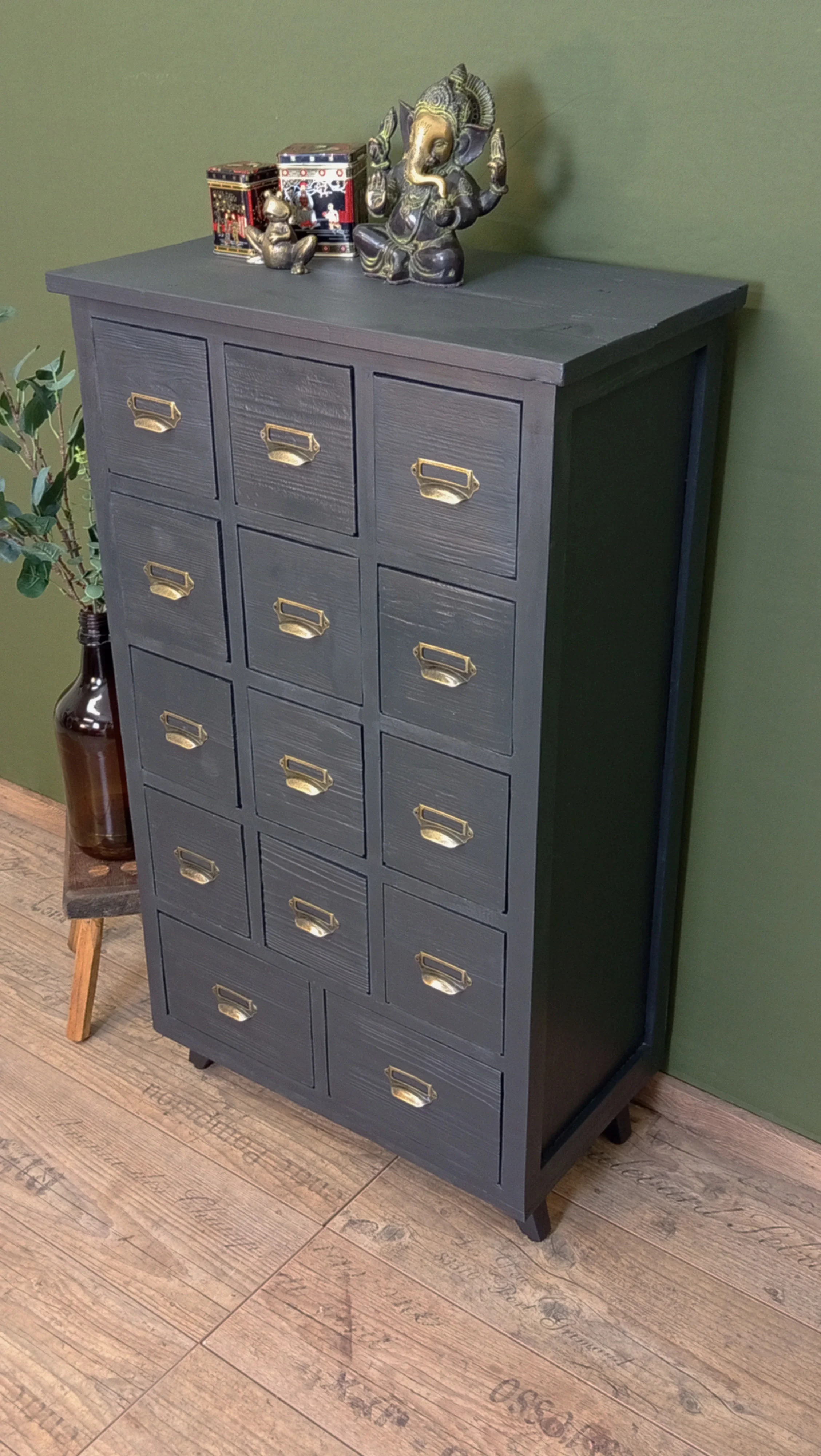 Dieses Apothekerschränkchen hat eine stille Ausstrahlung. Es drängt sich nicht auf – und doch steht es da, ruhig und stabil, mit seinem tiefen Anthrazitton und der ausgewogenen Form.