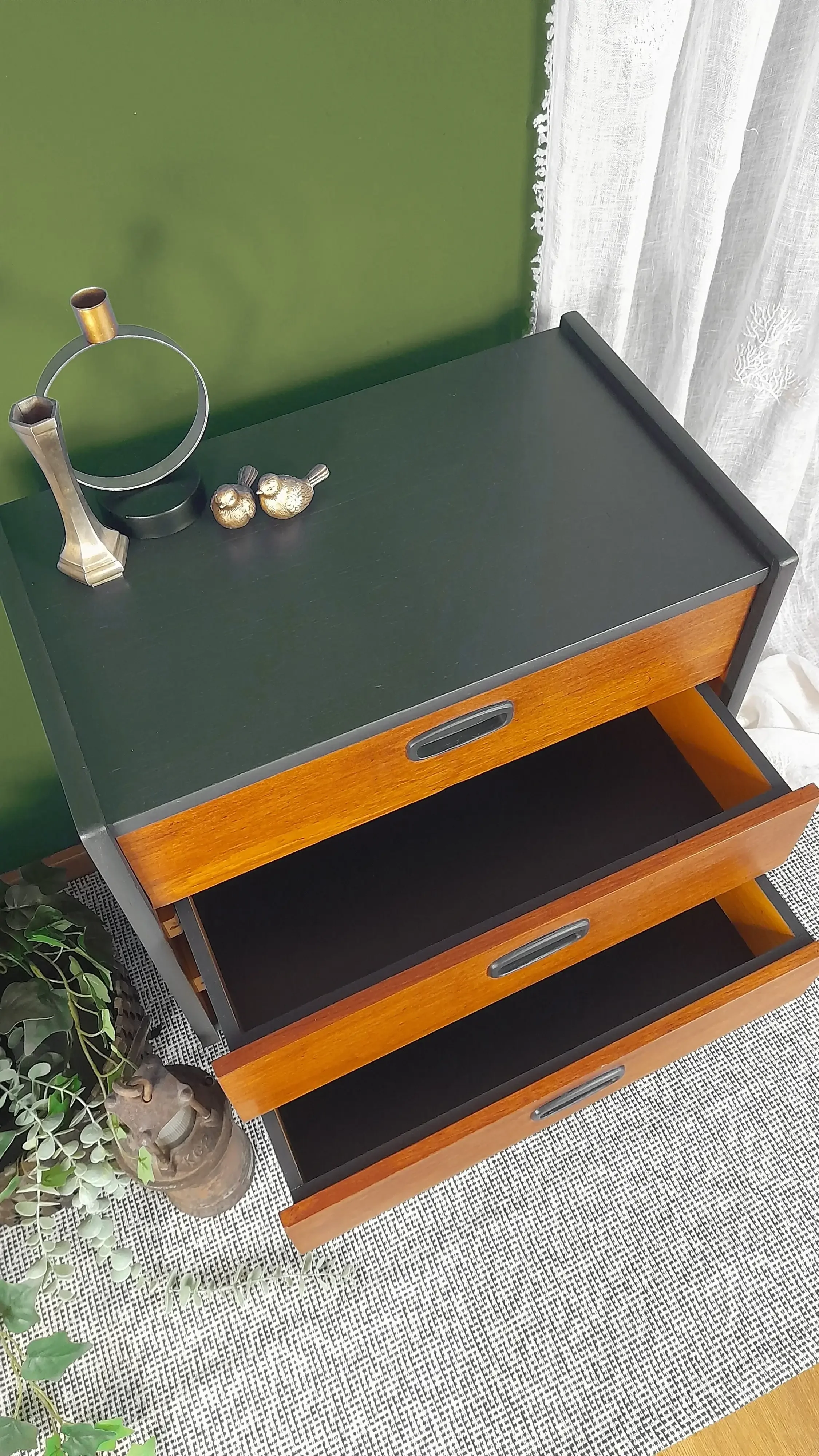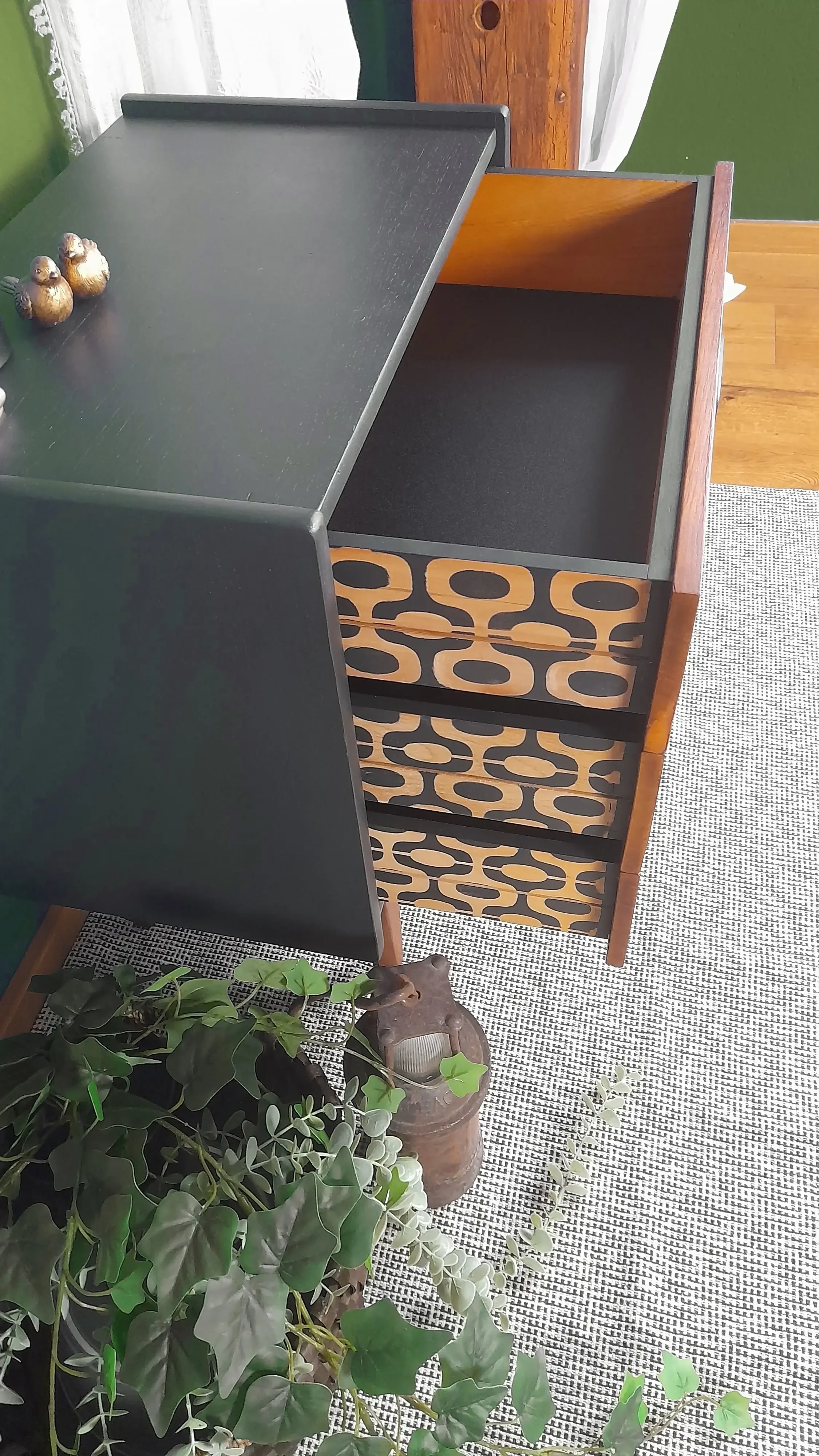 Dieses Kästchen hat Charakter. Die Form schlicht, das Design klar – aber was sofort ins Auge fällt, sind die Details. Schwarzmattes Gehäuse, warme Holzfronten, und dann diese Seiten... retro, grafisch, anders.