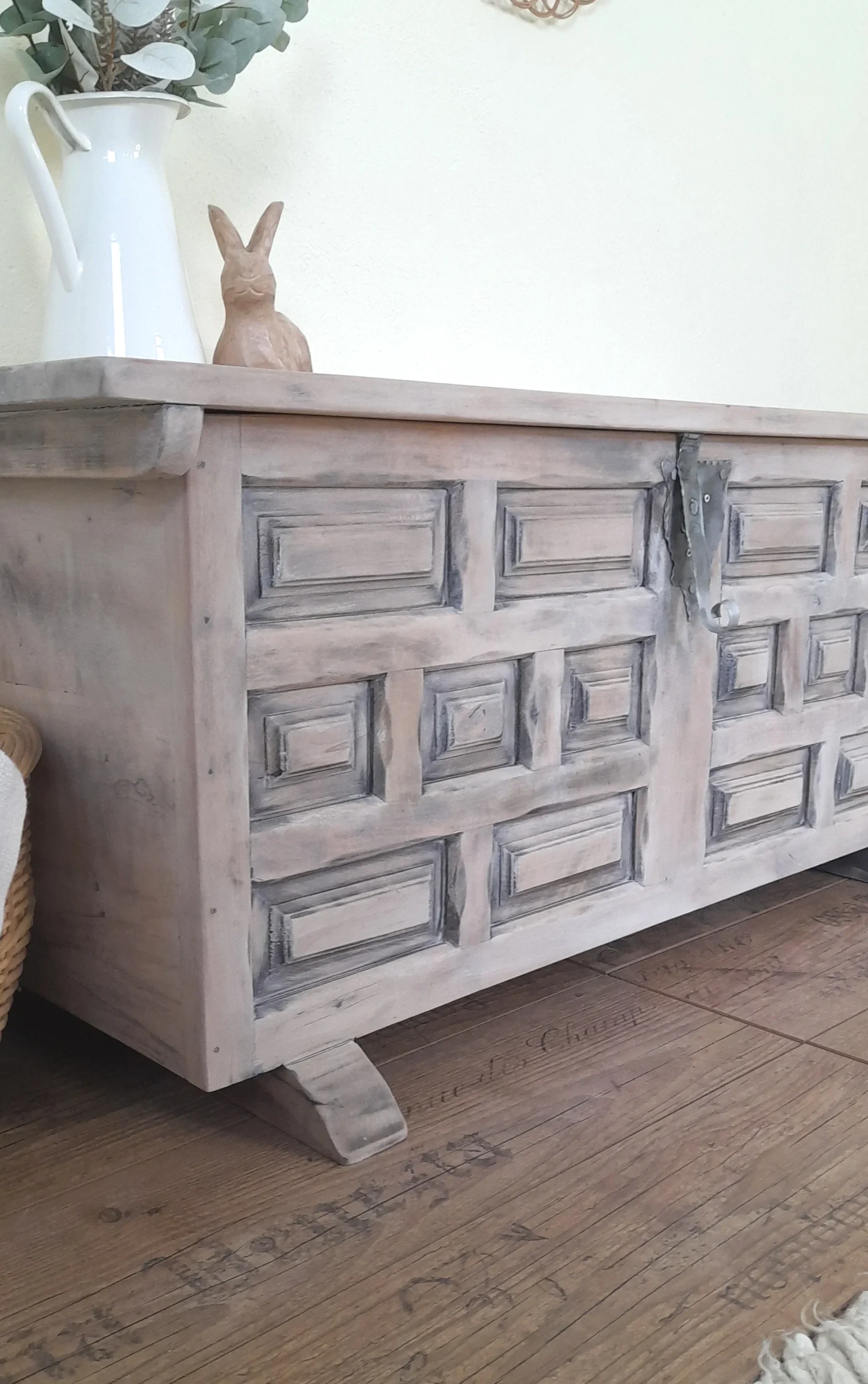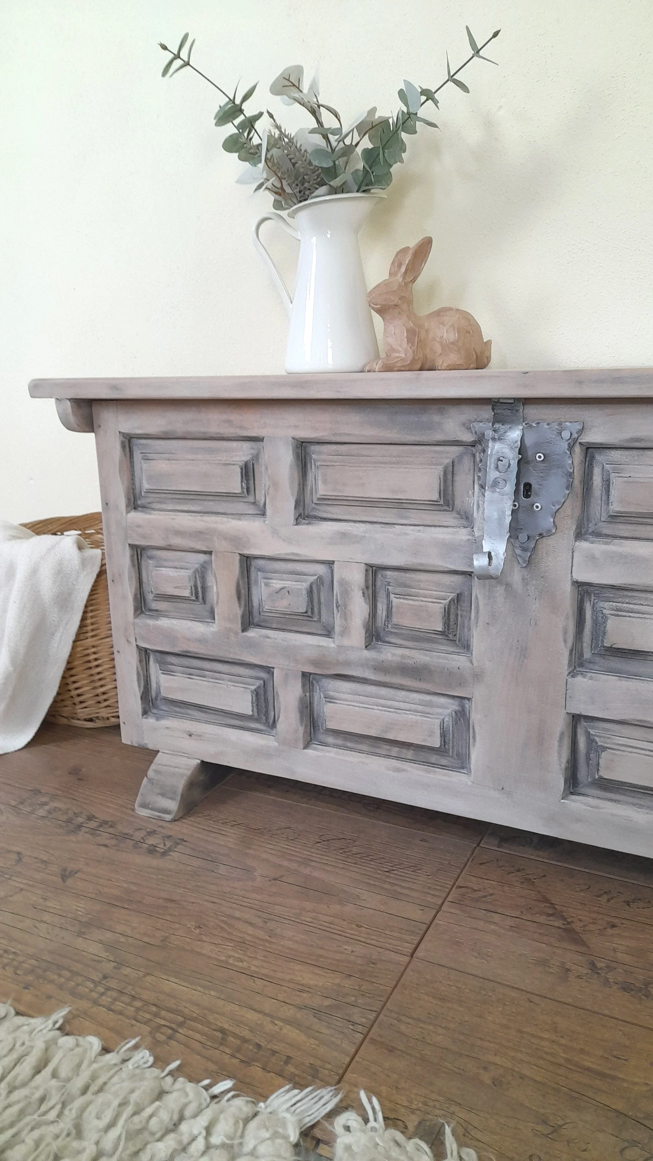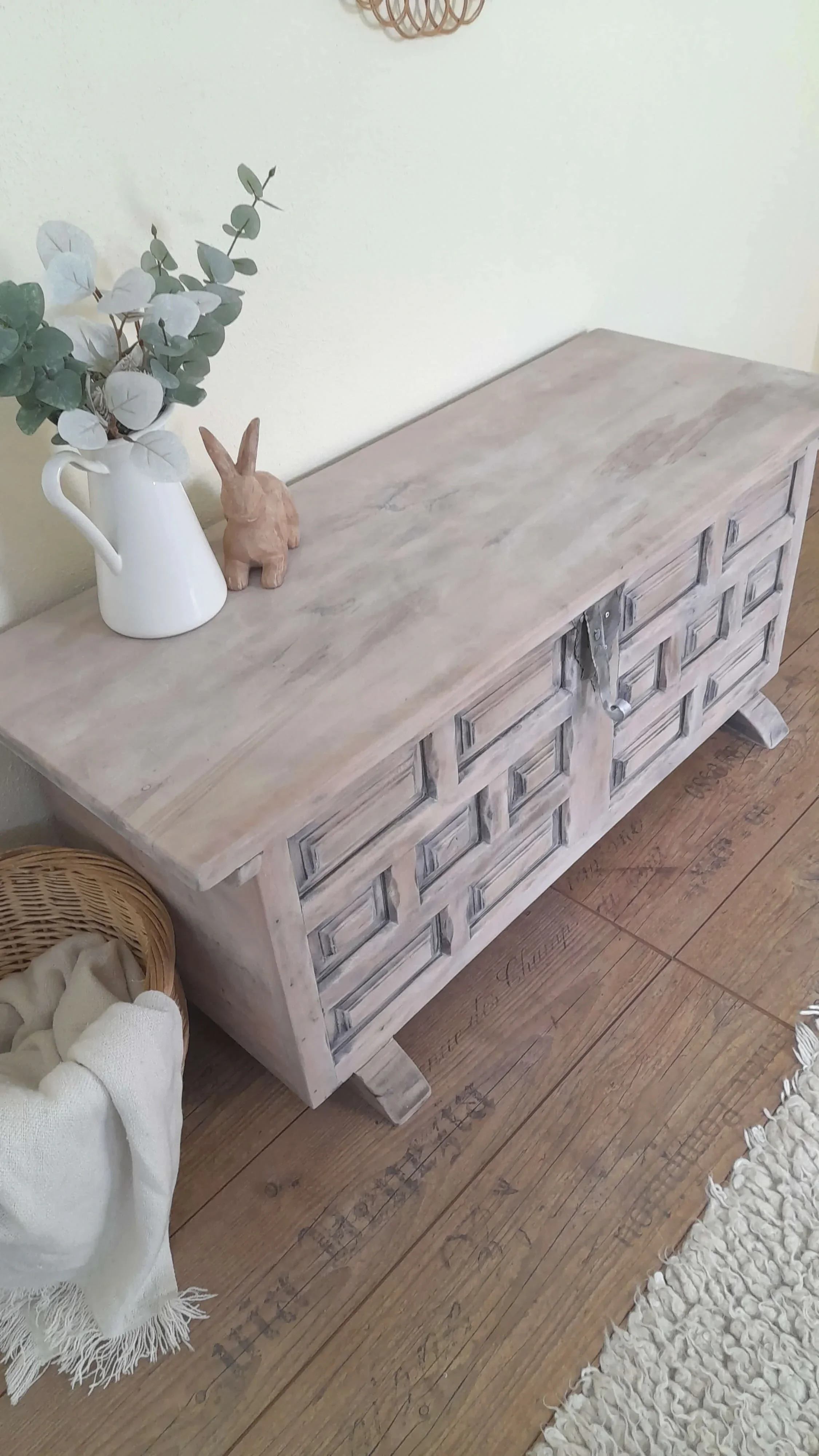 This wooden chest brings a little Castilian charm into the room – soft, romantic, with a touch of the past still in its bones. Its shape and lines were beautiful from the start, but the dark varnish made it feel a bit heavy, a bit too serious.